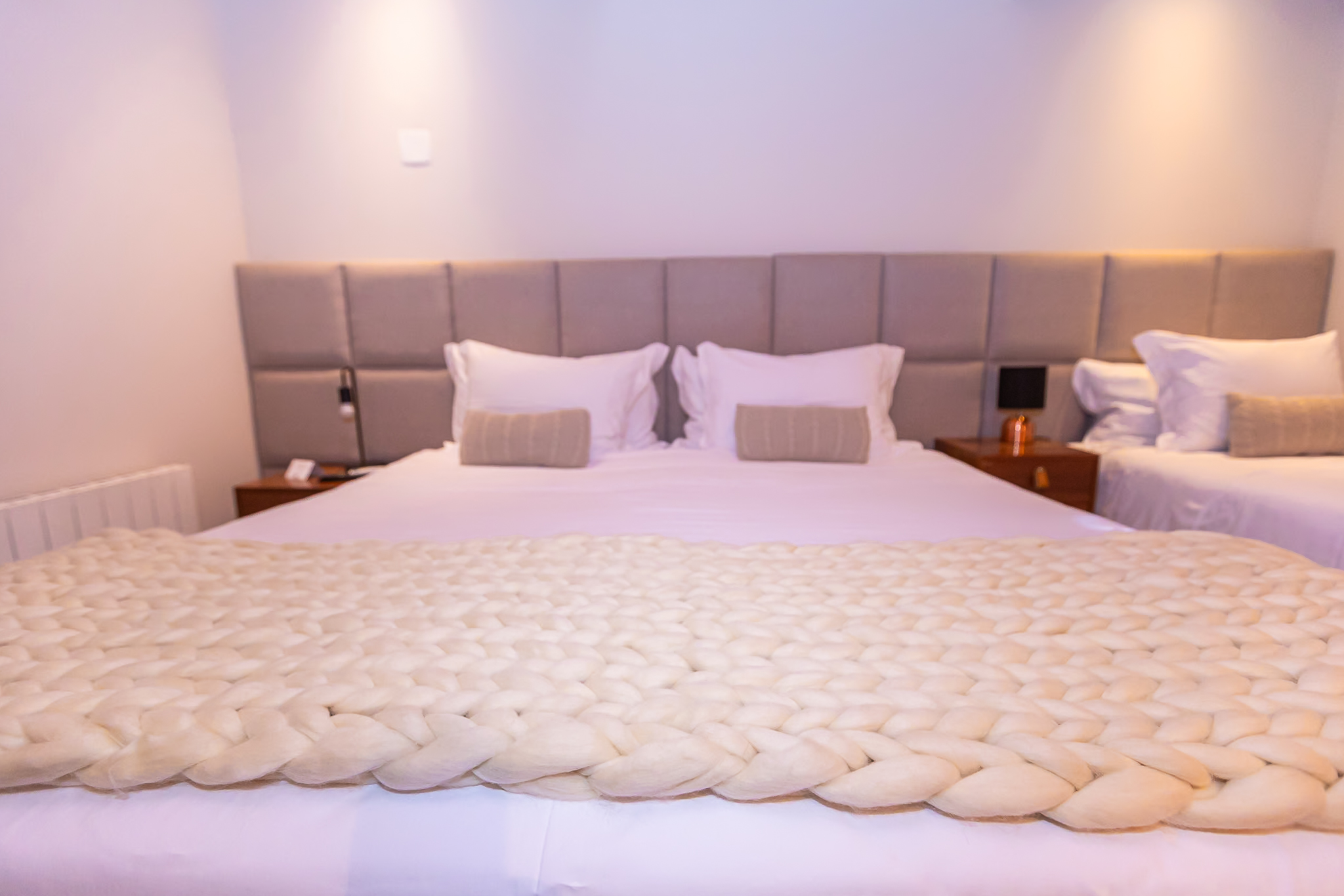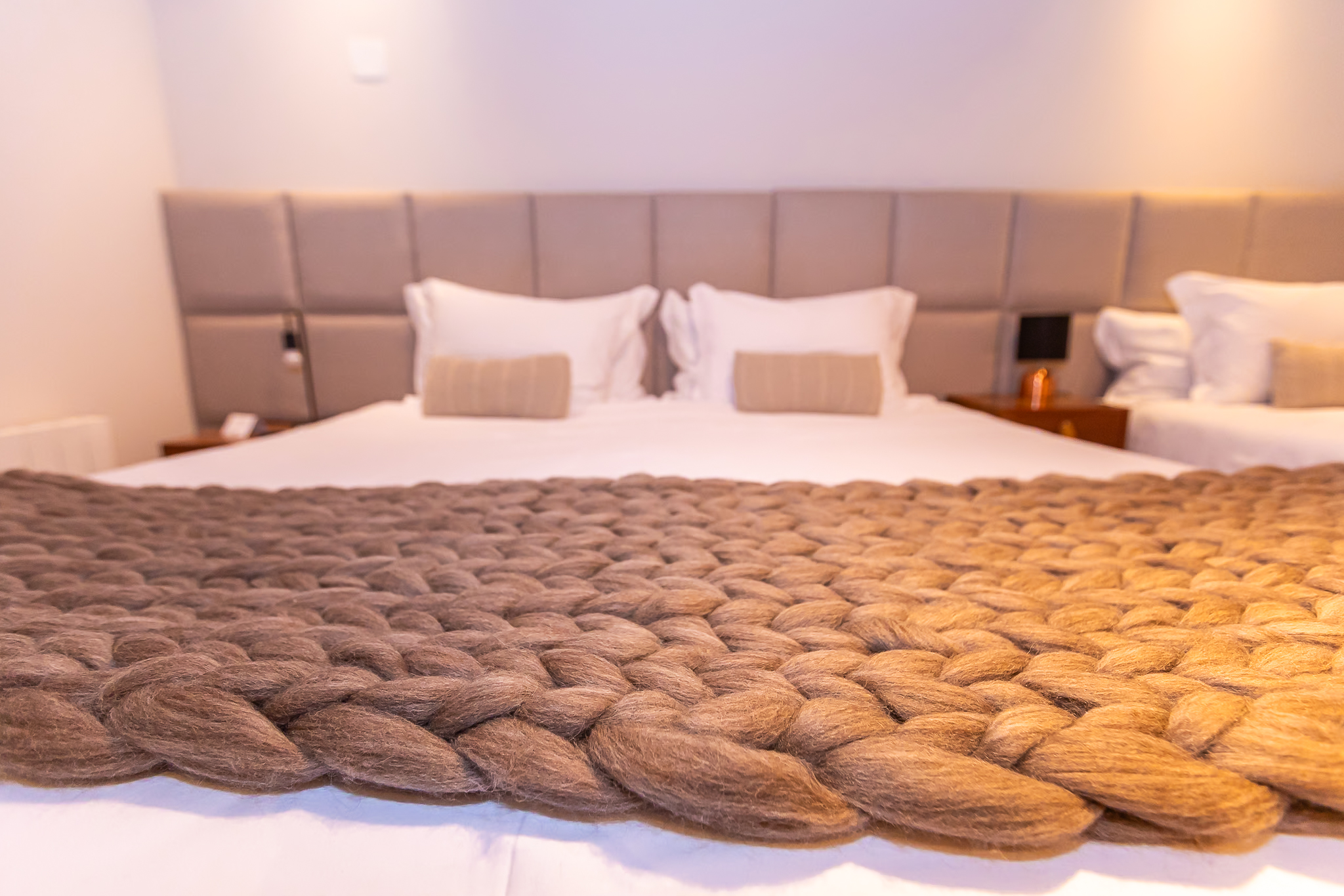 Técnica: A manta maxi tricot é desenvolvida utilizando a técnica do tricô de braço em lã natural cardada em ponto meia.